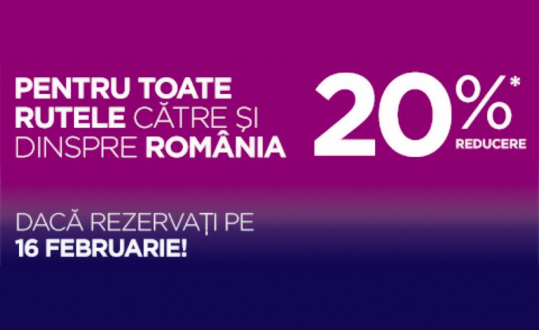Operatorul low-cost Wizzair a lansat astazi o promotie valabila pentru toate zborurile din/catre Romania: reducere de 20% la pretul care include taxele (mai putin cea de administrare), costurile obligatorii si un bagaj mic de cabina (42 x 32 x 25 cm).