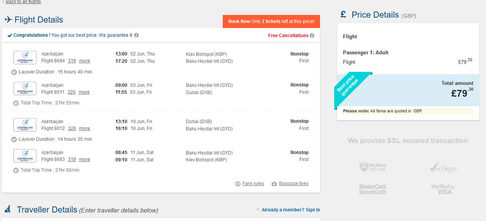 Pret extrem de mic pentru un zbor la First Class din Kiev spre Dubai: £79, adica putin peste 100€!