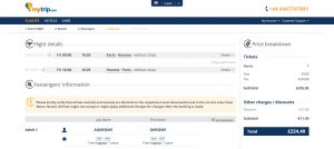 Pentru a cumpara biletele, mergi pe momondo.co.uk, selecteaza destinatia si datele de calatorie, alege cea mai ieftina oferta din lista de rezultate (mytrip.com) si efectueaza rezervarea.